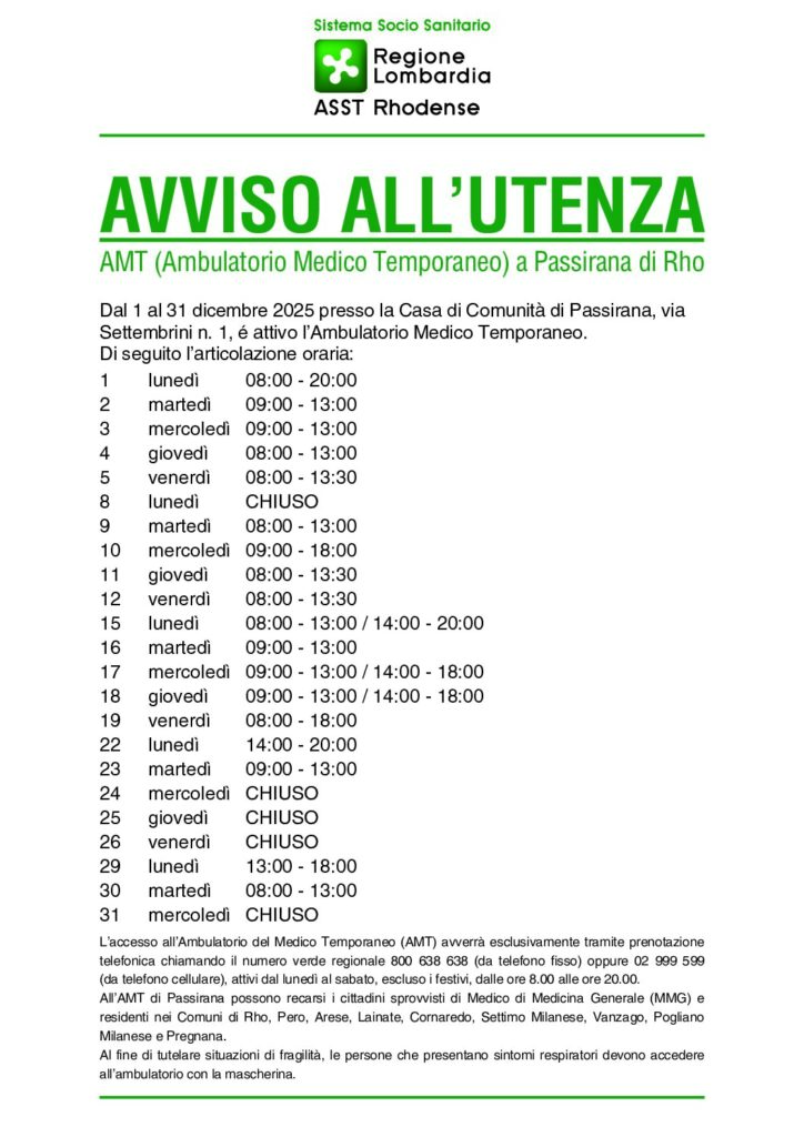 All’AMT di Passirana in via Settembrini 1 a Rho possono recarsi i cittadini sprovvisti di Medico di Medicina Generale (MMG) residenti nei Comuni di Rho, Pero, Arese, Lainate, Settimo Milanese, Cornaredo, Vanzago, Pogliano Milanese e Pregnana Milanese.