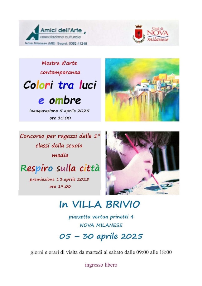 Sabato 5 aprile alle 15 in piazza Vertua Prinetti di Nova Milanese, il centro di cultura “Villa Brivio” ospiterà e inaugurerà la mostra d’arte contemporanea “COLORI TRA LUCI E OMBRE ” che sarà esposta al primo piano della sala cerimoniale.