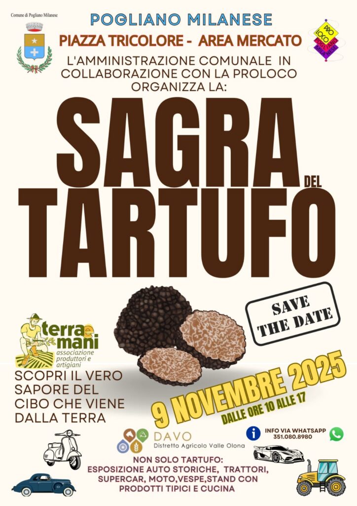 Domenica 9 novembre, dalle 9:30 alle 18:30, nella area mercato, in piazza Tricolore, si terrà la Sagra del Tartufo.