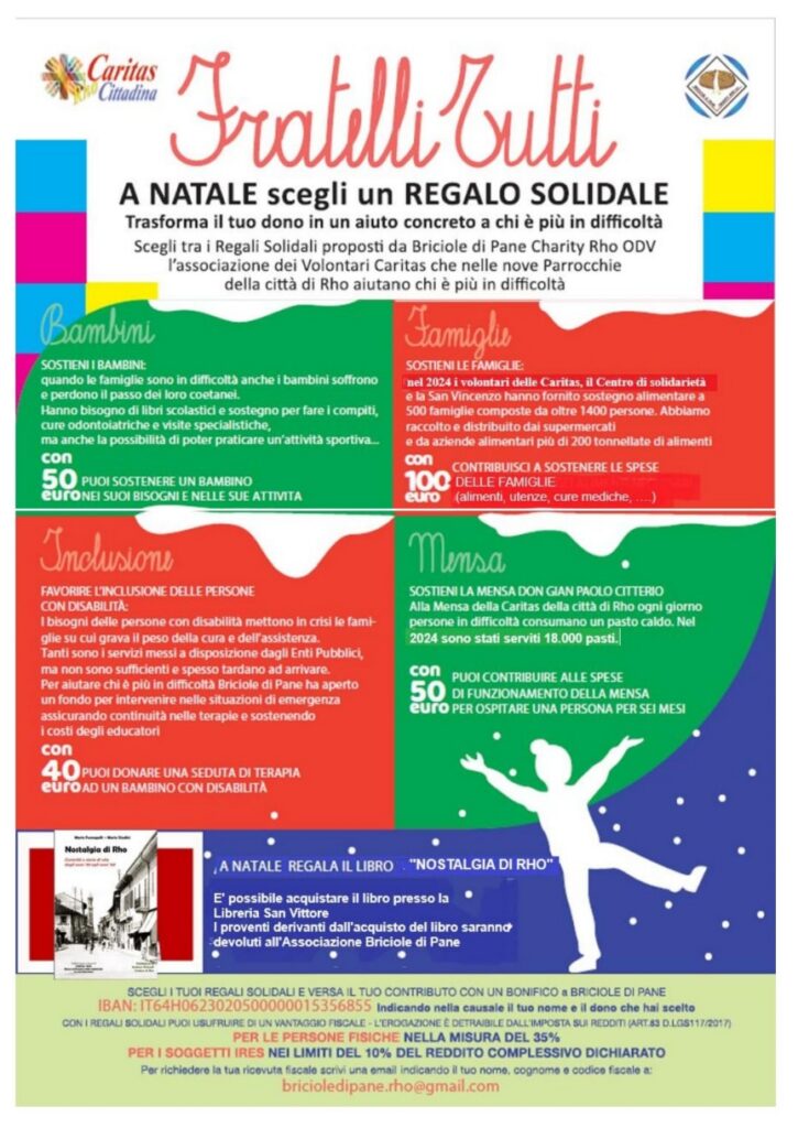 Sono tanti i Regali Solidali proposti da Briciole di Pane Charity Rho Odv, associazione dei Volontari Caritas, che nelle nove parrocchie della città aiutano chi è più in difficoltà.