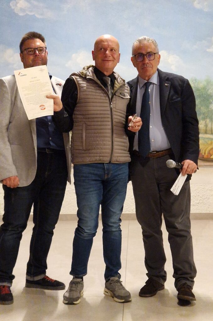 Dopo un primo momento di convivialità, i presenti hanno preso posto ai tavoli per assistere alla cerimonia di premiazione dei volontari più anziani. Ogni volontario è stato accompagnato da un caloroso applauso durante il percorso dal tavolo al palco, dove ha ricevuto un attestato di ringraziamento per il tempo dedicato agli altri, un omaggio floreale e una scatoletta contenente una spilla con lo stemma di Rho Soccorso e il numero degli anni di servizio.